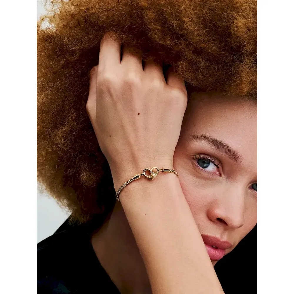 Update your collection. Hand-finished in 14k gold plating, this bracelet features a flexible, textured chain and an infinity-detailed heart-shaped clasp. Add charms with silicone grips or safety chains to secure your styling.