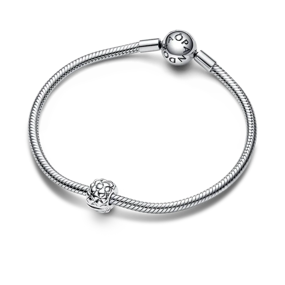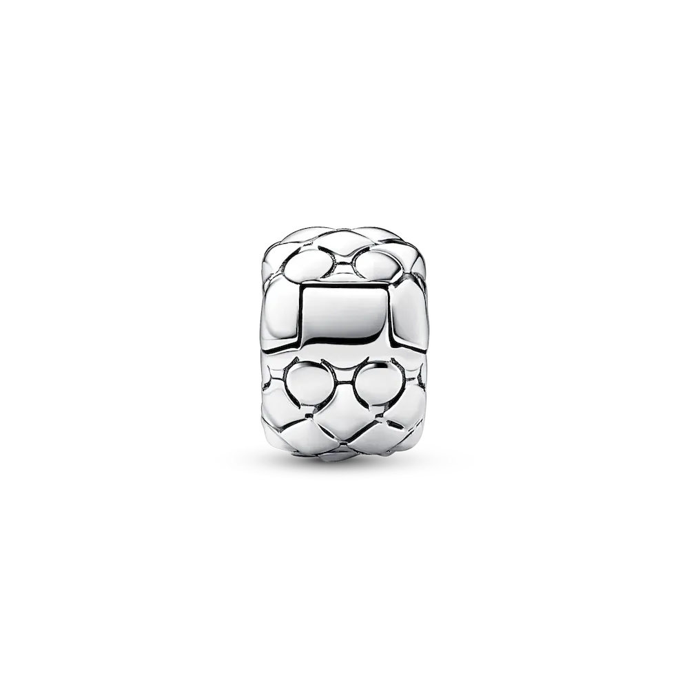 Bring even more of the iconic studded texture into your look with the Studded Pandora Clip Charm in sterling silver. With its pyramid and spherical stud texture, this clip charm will feel right at home on your studded chain bracelet, as its pattern echoes the new Pandora icon. The charm features no silicone grips on the inside, so it will add movement to your styling, while spacing your charms. It will stay fixed when styled on threads, however, spacing your charms. Create a camouflage-style look by adding it to the studded chain of the same tone.