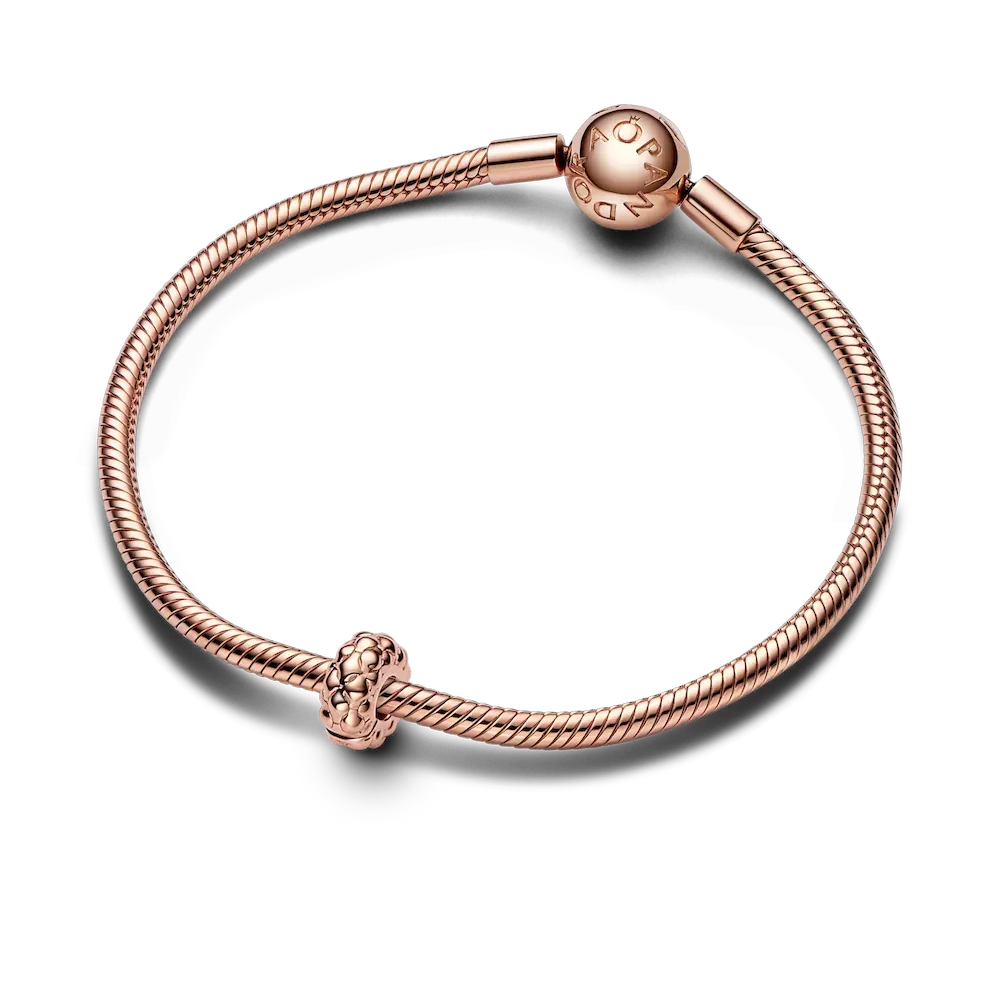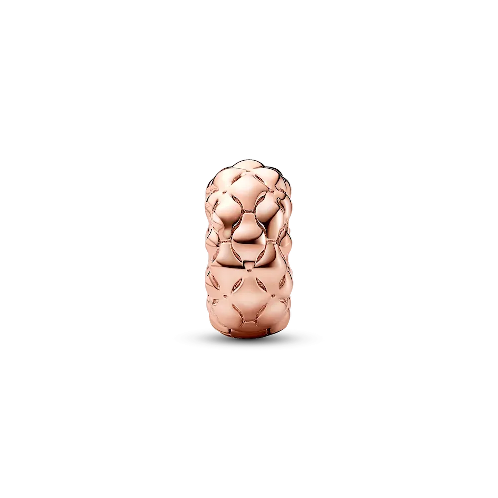 Bring even more of the iconic studded texture into your look with the Studded Pandora Clip Charm. With its pyramid and spherical stud texture and a thin profile, this clip charm in our 14k rose gold-plated unique metal blend will feel right at home on your studded chain bracelet, as its pattern echoes the new Pandora icon. The 14k rose gold-plated charm features silicone grips on the inside and cannot be styled on threads, so it will stay fixed in one place on the chain as you move, while spacing out your charms. Create a camouflage-style look by adding it to the studded chain for a bold take.