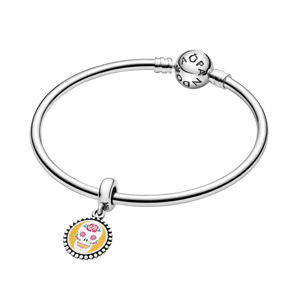 Celebrate life and love with the Sugar Skull Dangle Charm. Hand-finished in sterling silver, this vibrant charm showcases a sugar skull design, symbolizing DÃa de los Muertos and the honoring of loved ones who have passed. Adorned with bright colors—pink, green, and orange, it captures the lively spirit of the celebration. This charm is a tribute to remembrance, joy, and colorful traditions.
