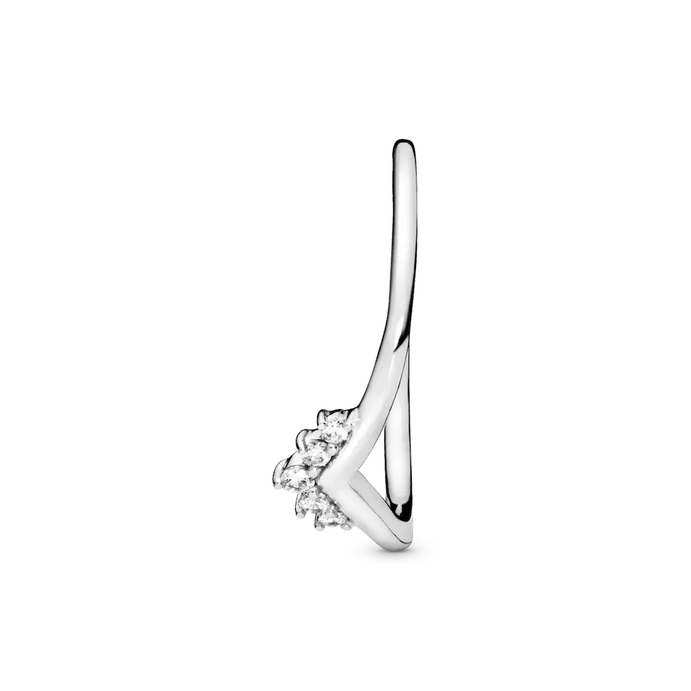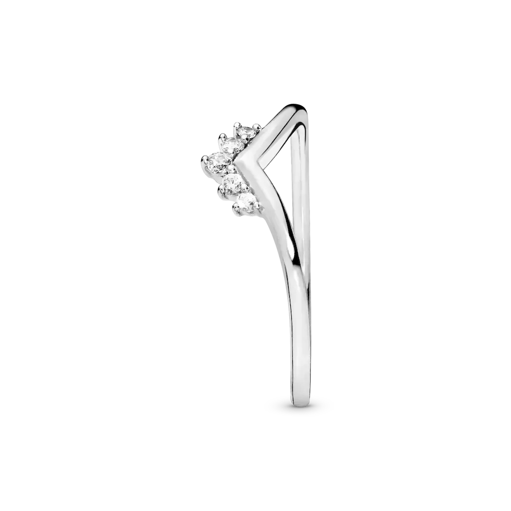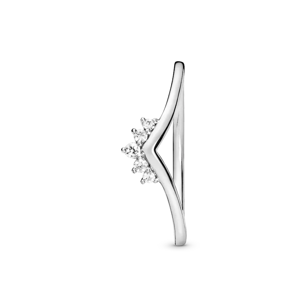 Turn heads wherever you go with this Tiara Wishbone ring hand-finished in smooth and polished sterling silver. The stackable wishbone ring features five claw-set clear cubic zirconia that form a delicate tiara crown on top of the ring. It’s perfect worn by itself or can be used to create more drama when stacked with wishbone rings in mixed metals, like sterling silver and Pandora Shineâ„¢ (18k gold-plated sterling silver), depending on the feeling you’re looking for.