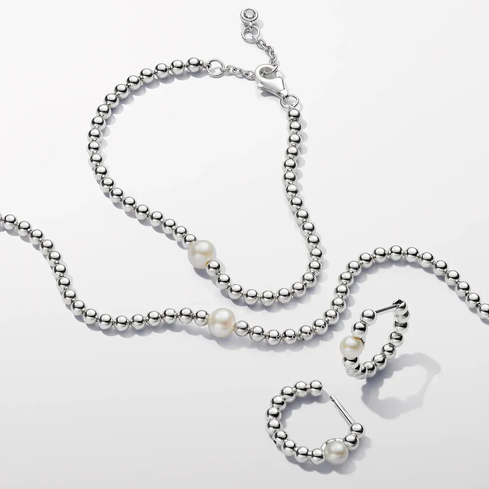 Bring on the beads with our Treated Freshwater Cultured Pearl & Beads Hoop Earrings in sterling silver. A single treated freshwater cultured pearls is featured on each hoop, complemented by a row of polished metal beads. The central pearl, slightly larger, adds a captivating focal point. With a secure click closure, these hoop earrings embody timeless sophistication. Sold as a pair, this design seamlessly blends classical elements with modern aesthetics. Please note each treated freshwater cultured pearl is unique and can vary in size and color; normal wear and tear may occur with this material. Our freshwater cultured pearls are treated with bleaching and luster enhancement.
