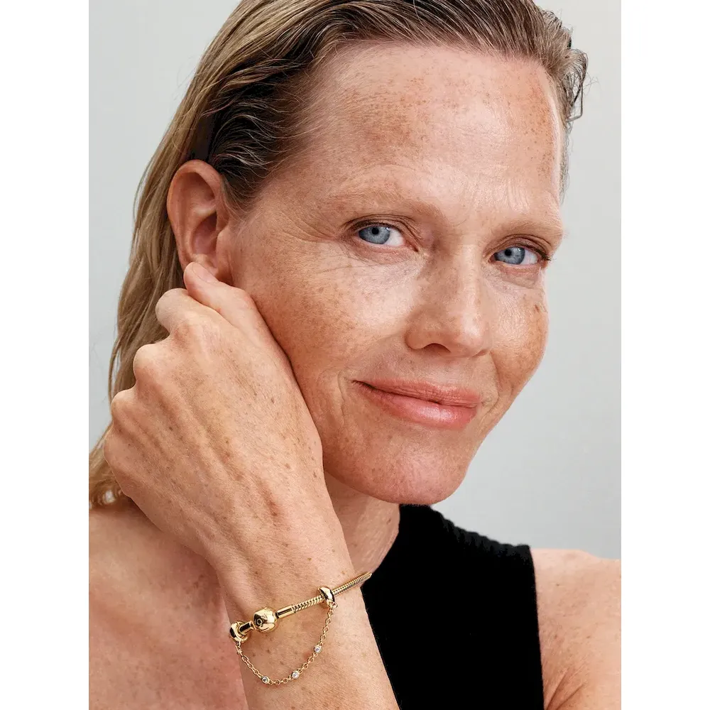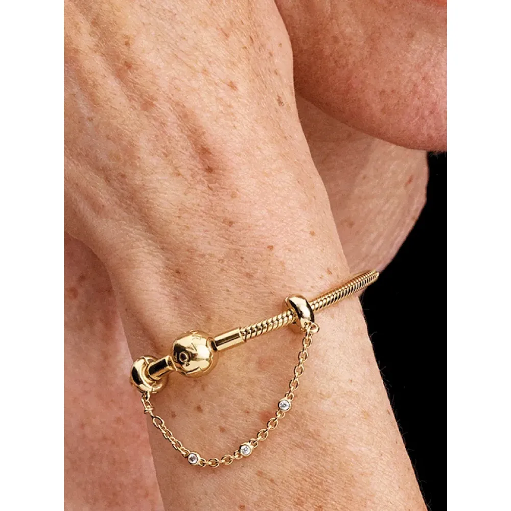 Keep your treasures safe with this 14k gold-plated safety chain. Each bail has threads inside to secure the charms on your Pandora Moments bracelet. It features three clear bezel-set stones on the chain to bring a touch of sparkle to your style. Perfect piece to add to your collection or to gift to the charm lover in your life.