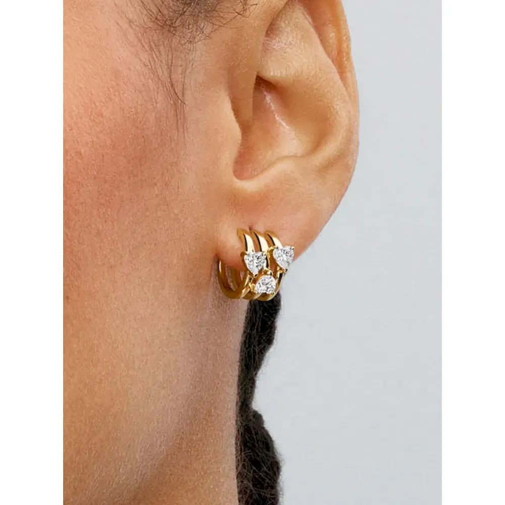 Celebrate love and individuality with these contemporary sparkling hoops. Made from our 14k gold-plated unique metal blend, these earrings feature six heart-cut cubic zirconia that overlap in a dynamic silhouette. A trio of lines are decorated with a smattering of hearts. Perfect for adding romantic sparkle to your jewelry, these earrings are versatile enough for any occasion.
