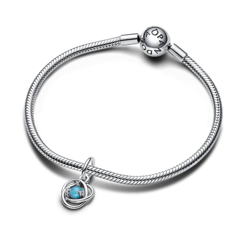 This intricate Turquoise Blue Eternity Circle Dangle Charm is a must-have infinity charm for your Pandora Moments collection. Crafted in lustrous sterling silver, it features an openwork infinity braid decorated with a central turquoise man-made crystal, elegantly surrounded by three clear cubic zirconia. The intricate design symbolizes eternity and adds an additional layer of meaning to the piece. Elevate your bracelet with this essential piece or gift it as a representation of an everlasting bond.