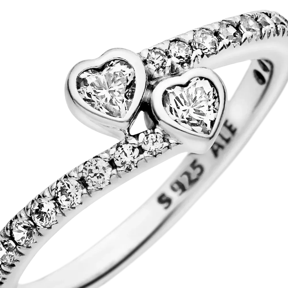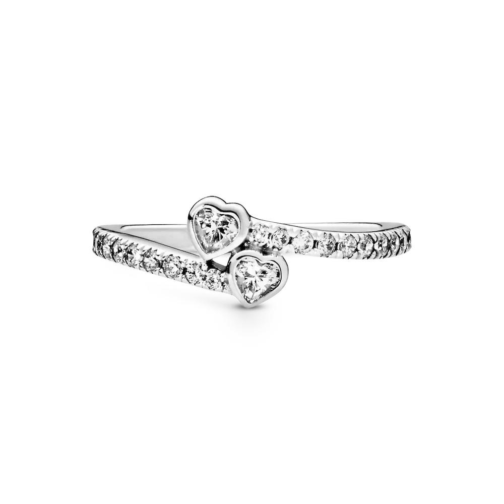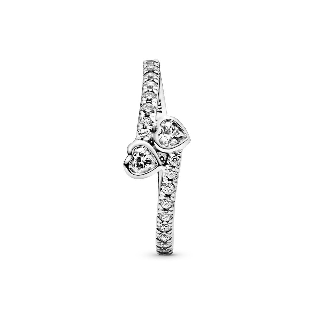 Two hearts entwined together make this stunning ring the ultimate symbol of love. Hand-finished in sterling silver, this Pandora heart ring is set with shimmering cubic zirconia stones and finished with two heart-shaped stones, evoking love and friendship. The perfect romantic gesture for Valentine’s Day, birthdays and anniversaries, or simply to say ‘I love you’.