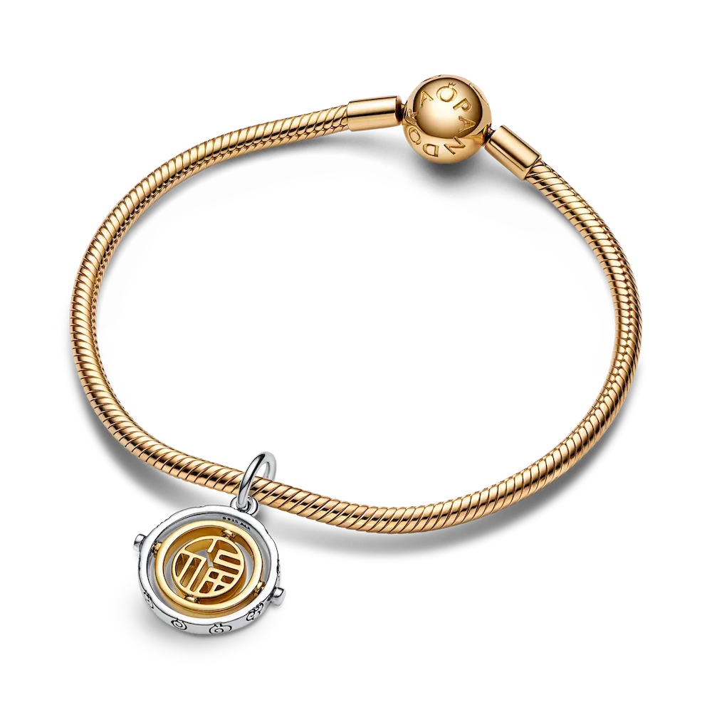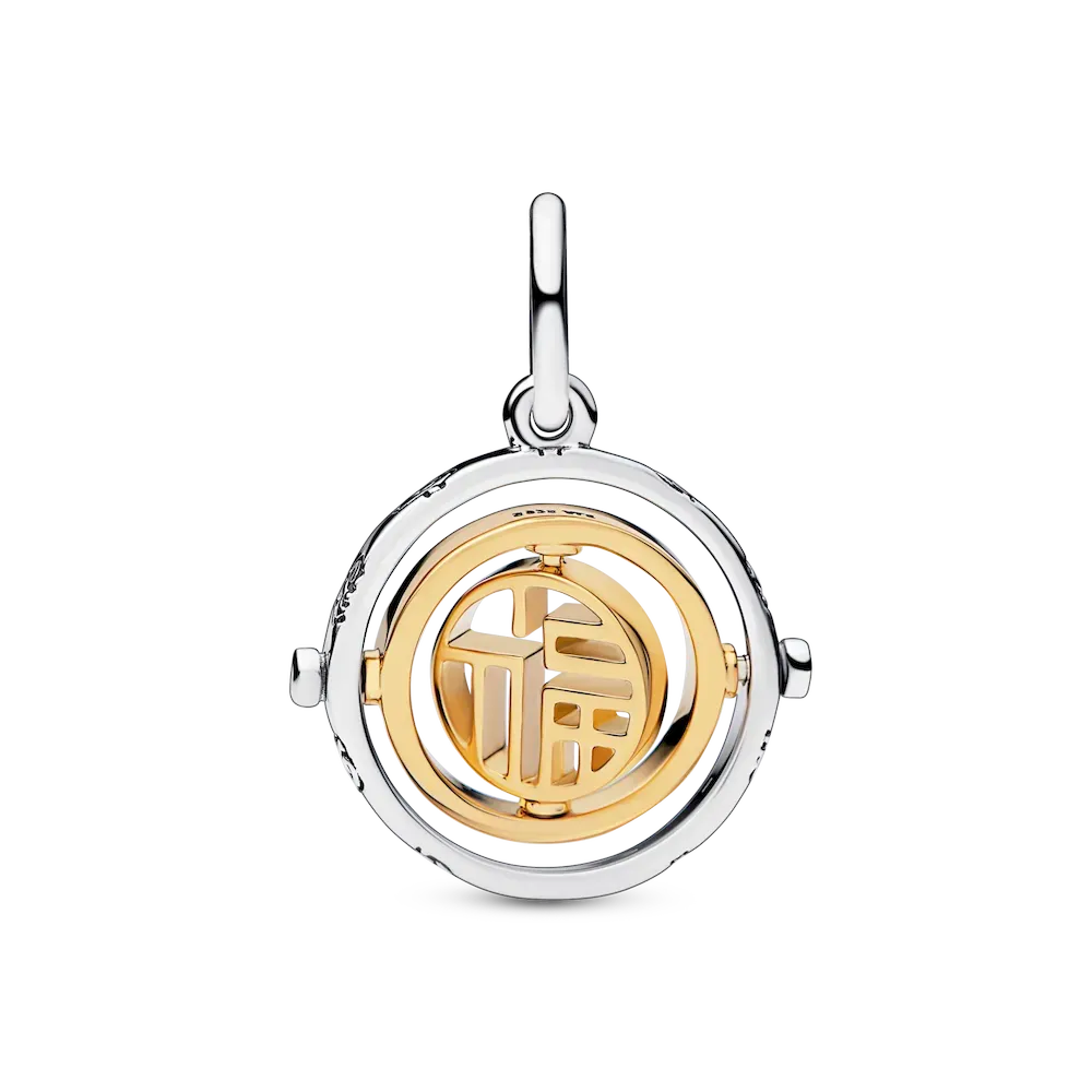 Add an icon of luck and prosperity to your collection with our Two-tone FĂș Spinning Dangle Charm. The FĂș symbol sits within two spinning 14k gold-plated circles and an outer sterling silver circle. A cut-out pattern is used to depict the ancient way of writing FĂș, calling back to a time-honored tradition. Wear it to celebrate the new year and keep luck on your side always.