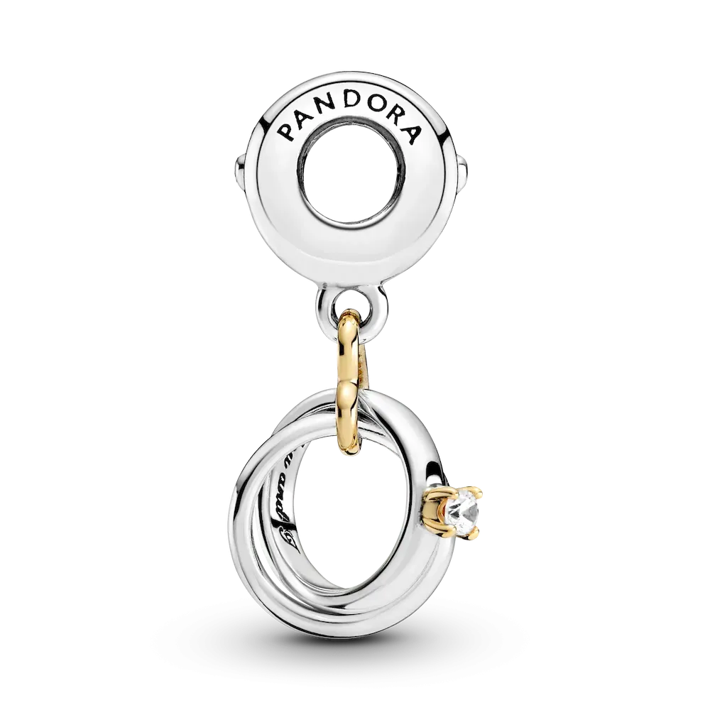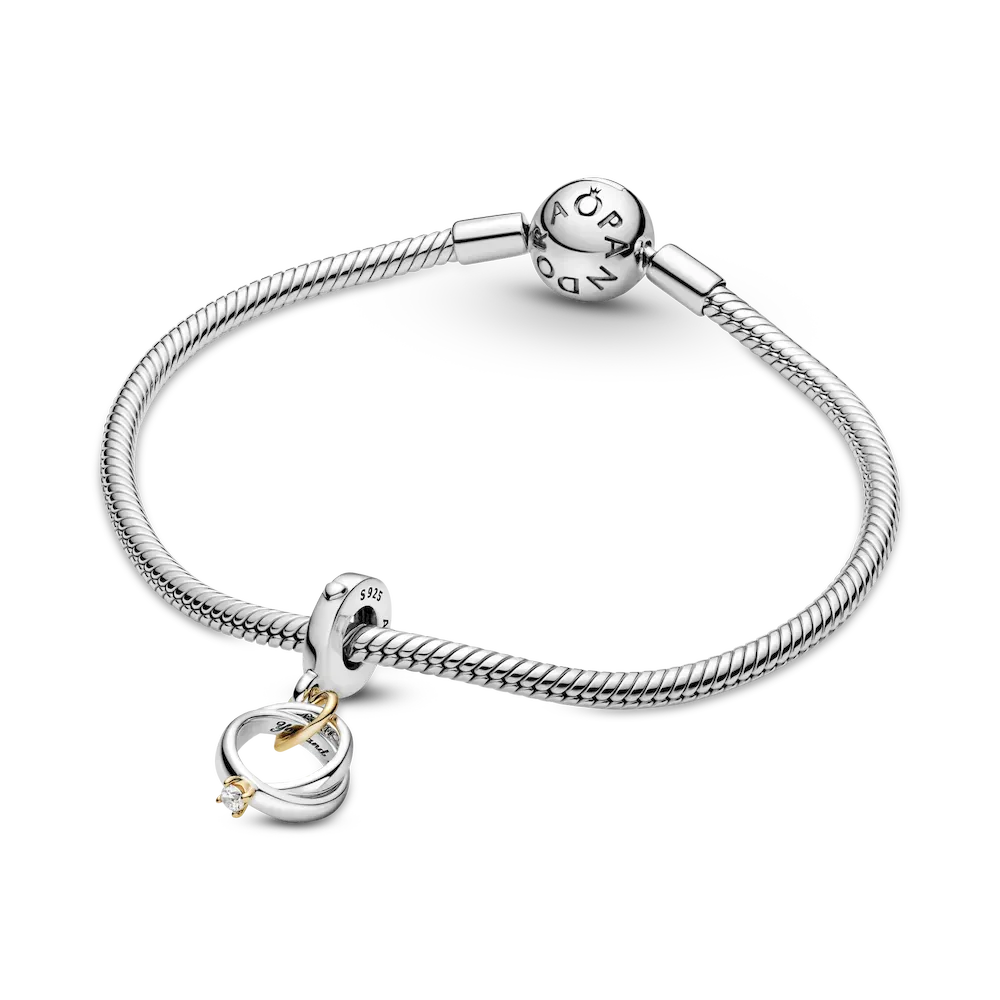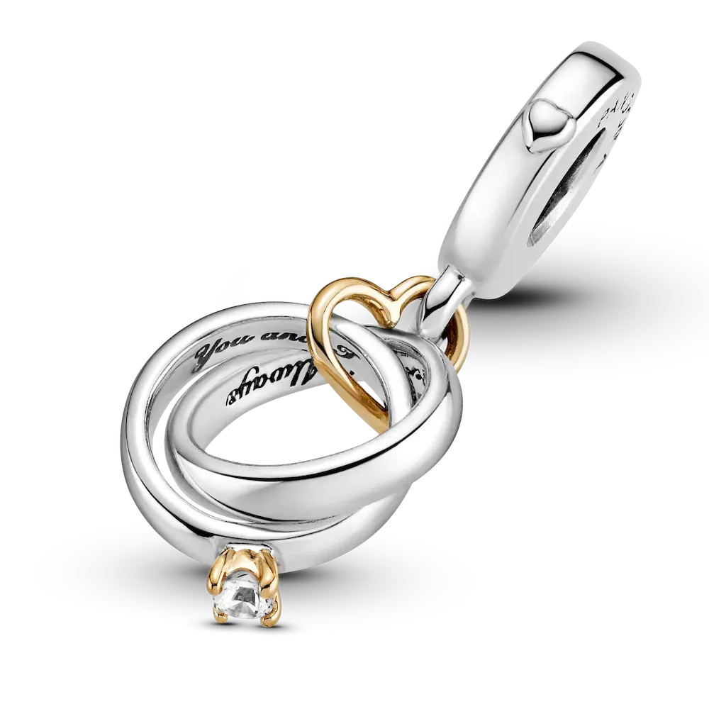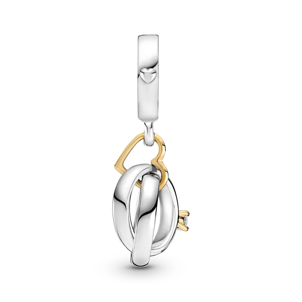 Carry a symbol of forever love with the Two-tone Wedding Rings Dangle Charm. This silver charm features a 14k gold heart link with two entwined rings, one sterling silver solitaire with a sparkling stone set in a 14k gold setting and one sterling silver band. Both feature the engraved messages ‘You and I’ and ‘Forever and always’ inside. The bail includes the iconic Pandora logo and two raised hearts. There’s no better way to symbolise your love and commitment.