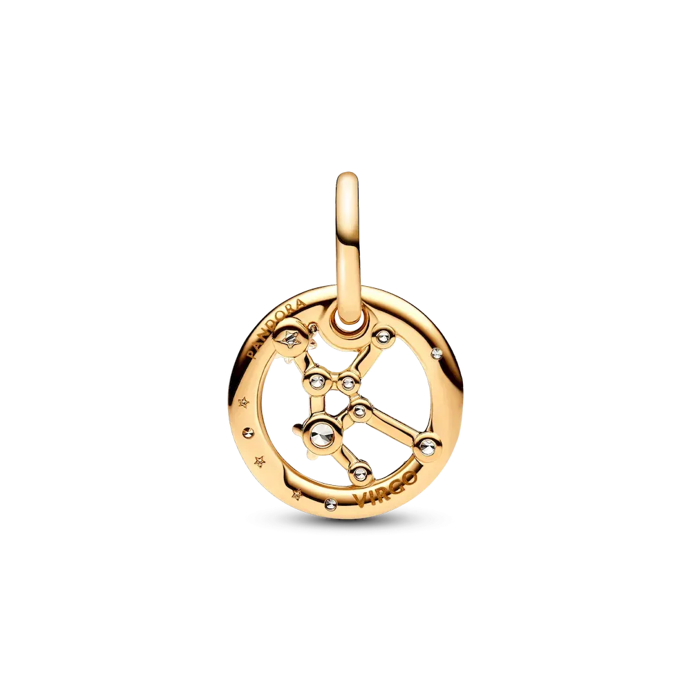 Let the stars guide your look with the Virgo Zodiac Dangle Charm. The dangle is crafted our 14k gold-plated unique metal blend, has a circular outer frame and features clear sparkling cubic zirconia as well as the shape of the Virgo zodiac sign. The back side of the frame is engraved with