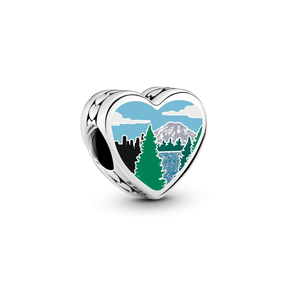 Celebrate your love for the Evergreen State with the Washington State Scene Charm. Hand-finished in sterling silver, this charm captures the heart of Washington with intricate details: a deep green heart with