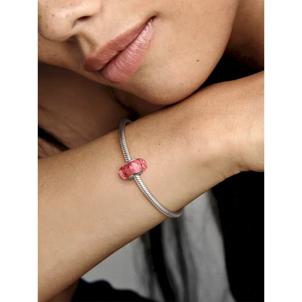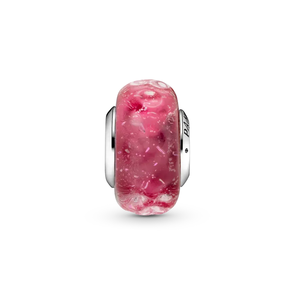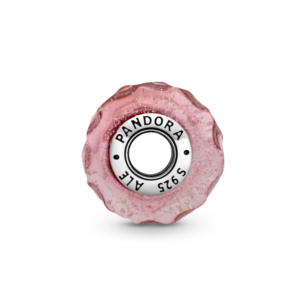 Colorful and sophisticated, the Wavy Fancy Pink Murano Glass Charm can elevate any outfit. Transform your look from ordinary to extraordinary with this Fancy Pink colored Murano glass charm filled with glitter and topped with a wavy glass surface. A touch smaller than our traditional Murano charms, this charm is the perfect complement to your style. Every Murano glass charm is hand finished and features a sterling silver core engraved with the Pandora logo.